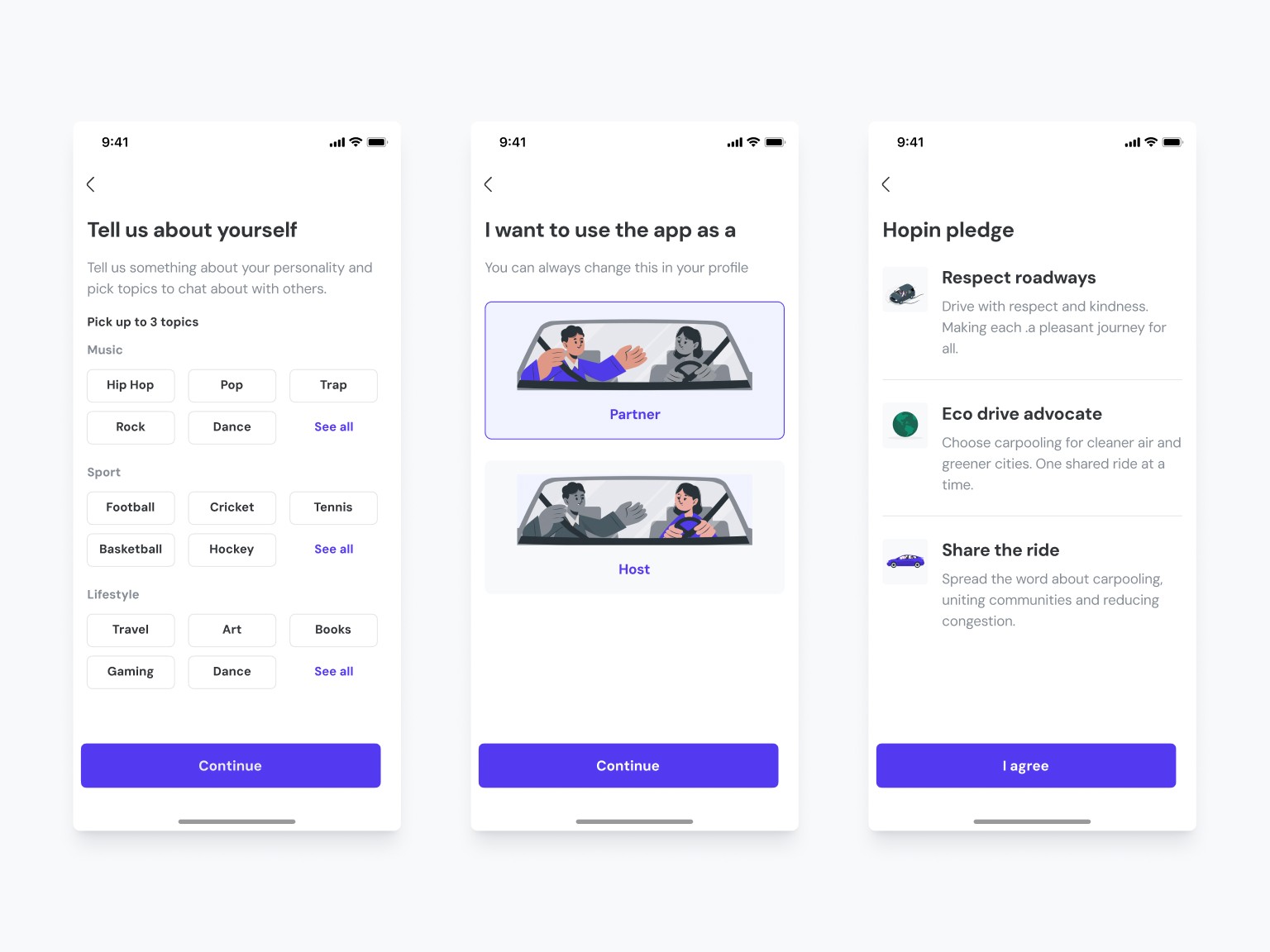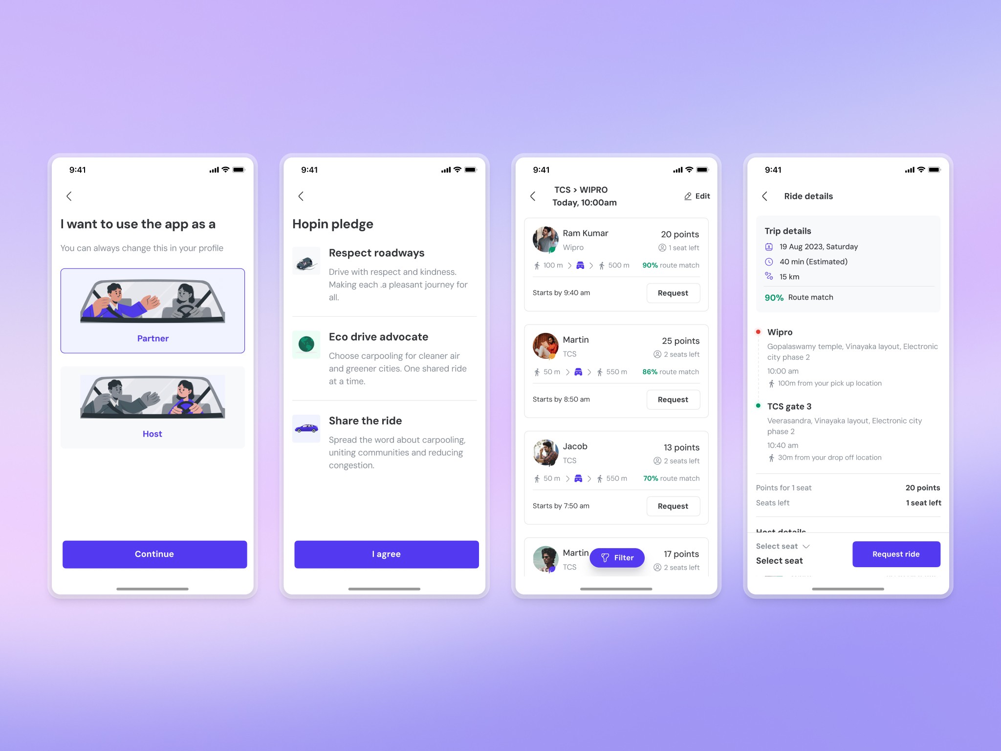 Hopin is an app that connects you with nearby hosts (drivers) and partners (passengers) by filling empty seats in cars to minimize traffic, emissions, and travel costs.
