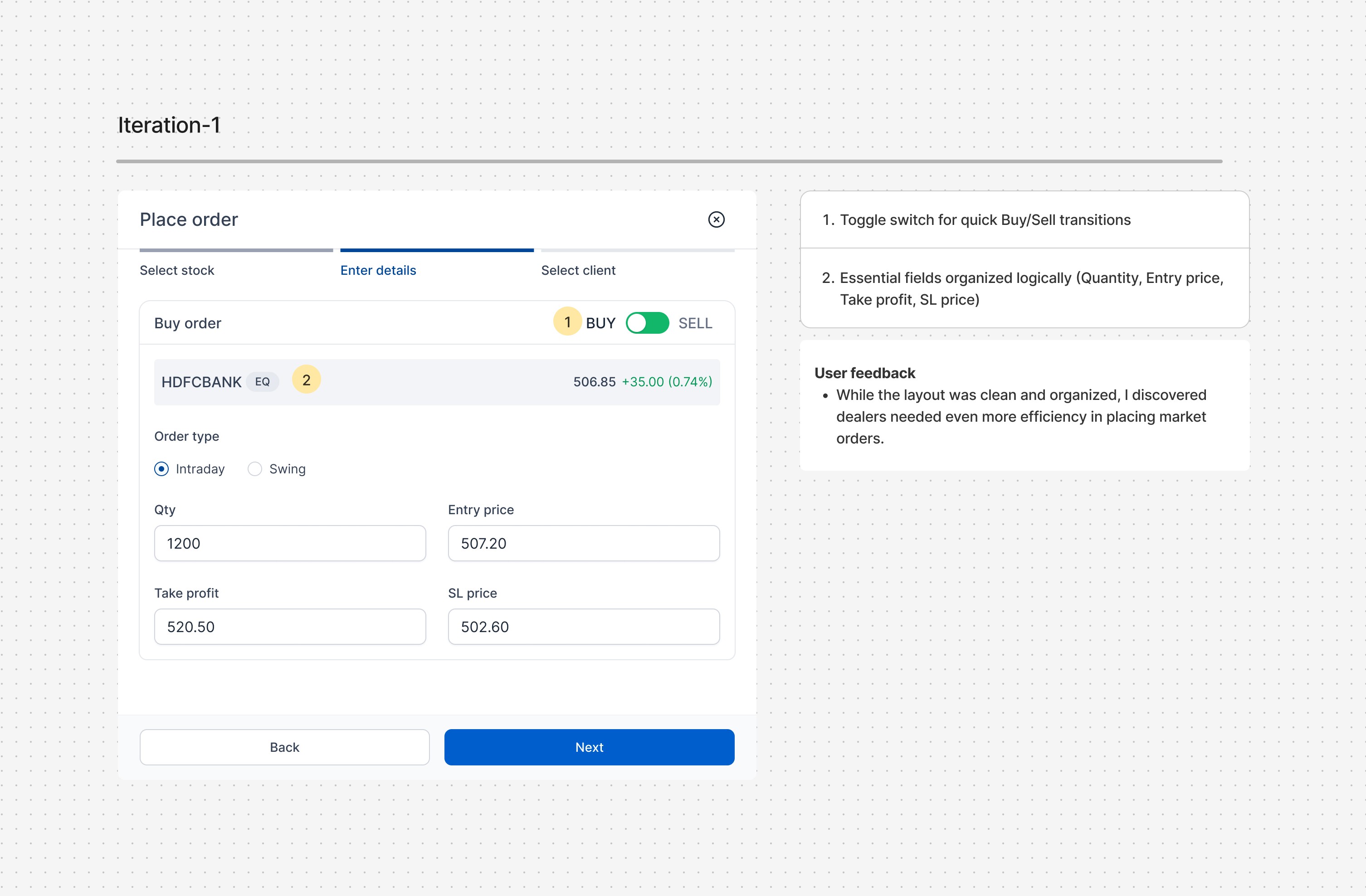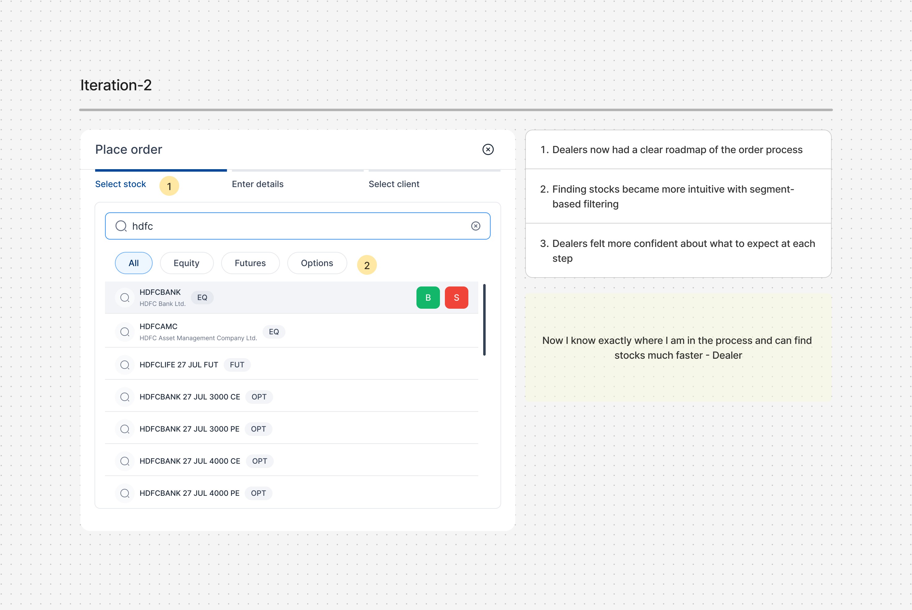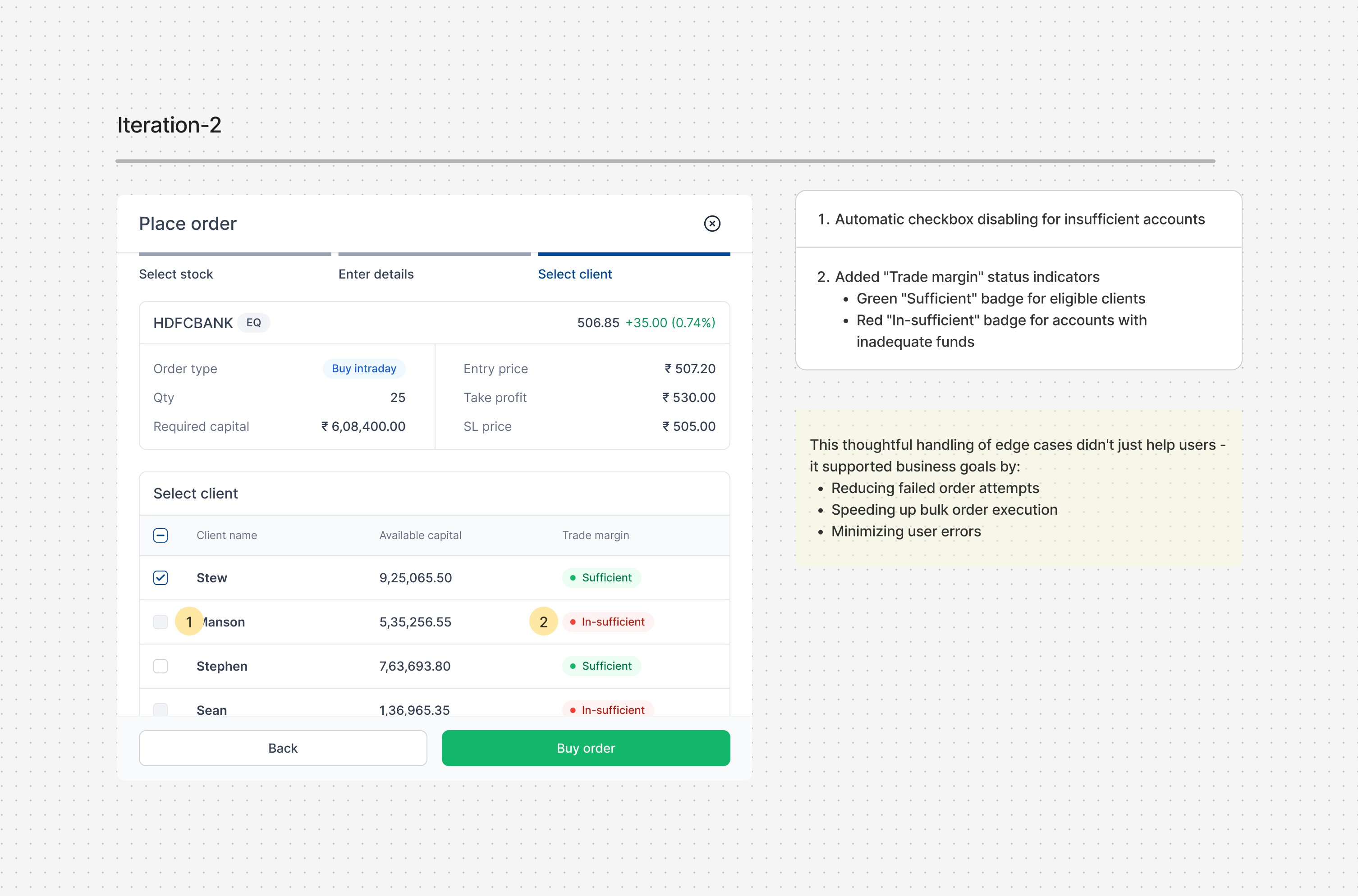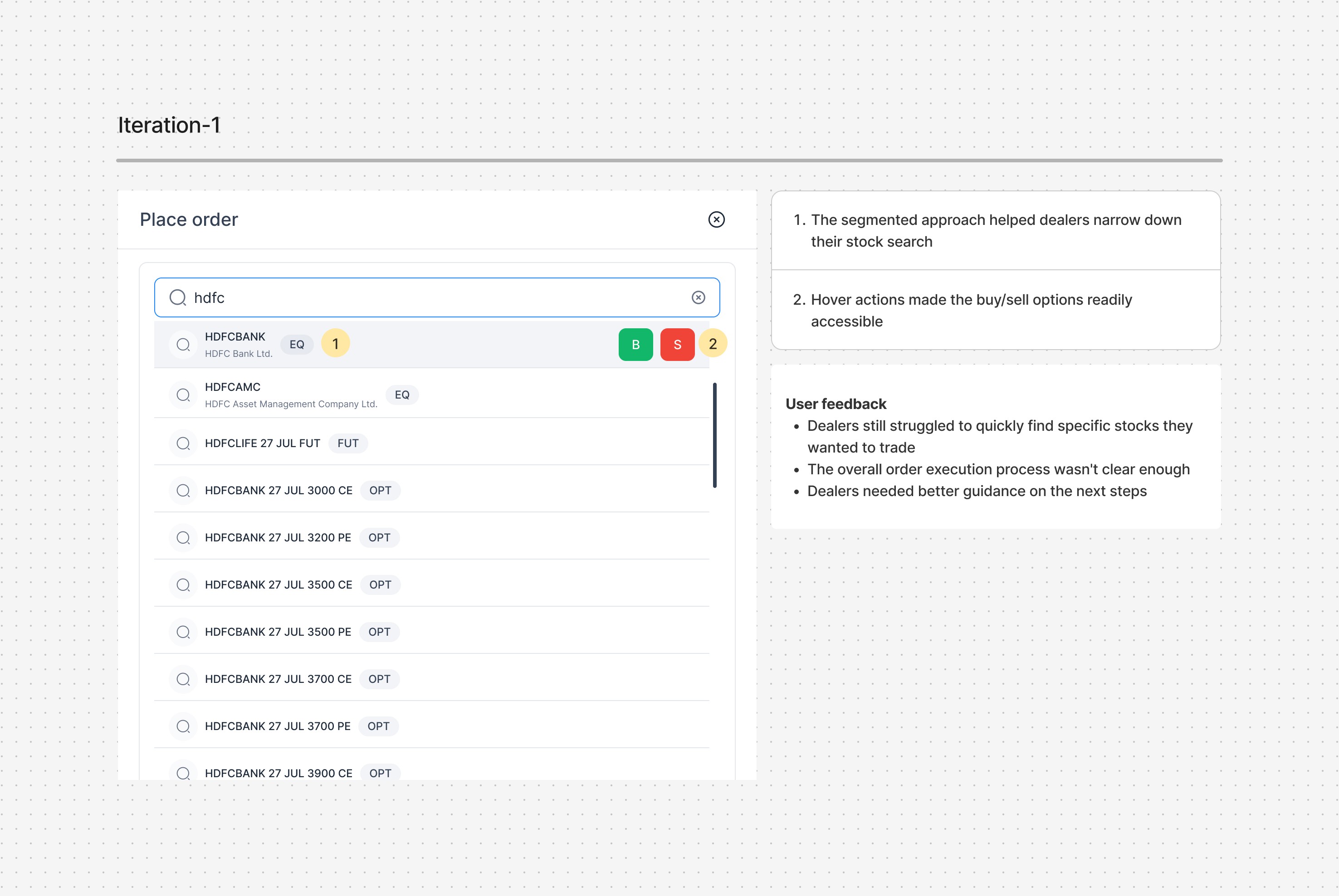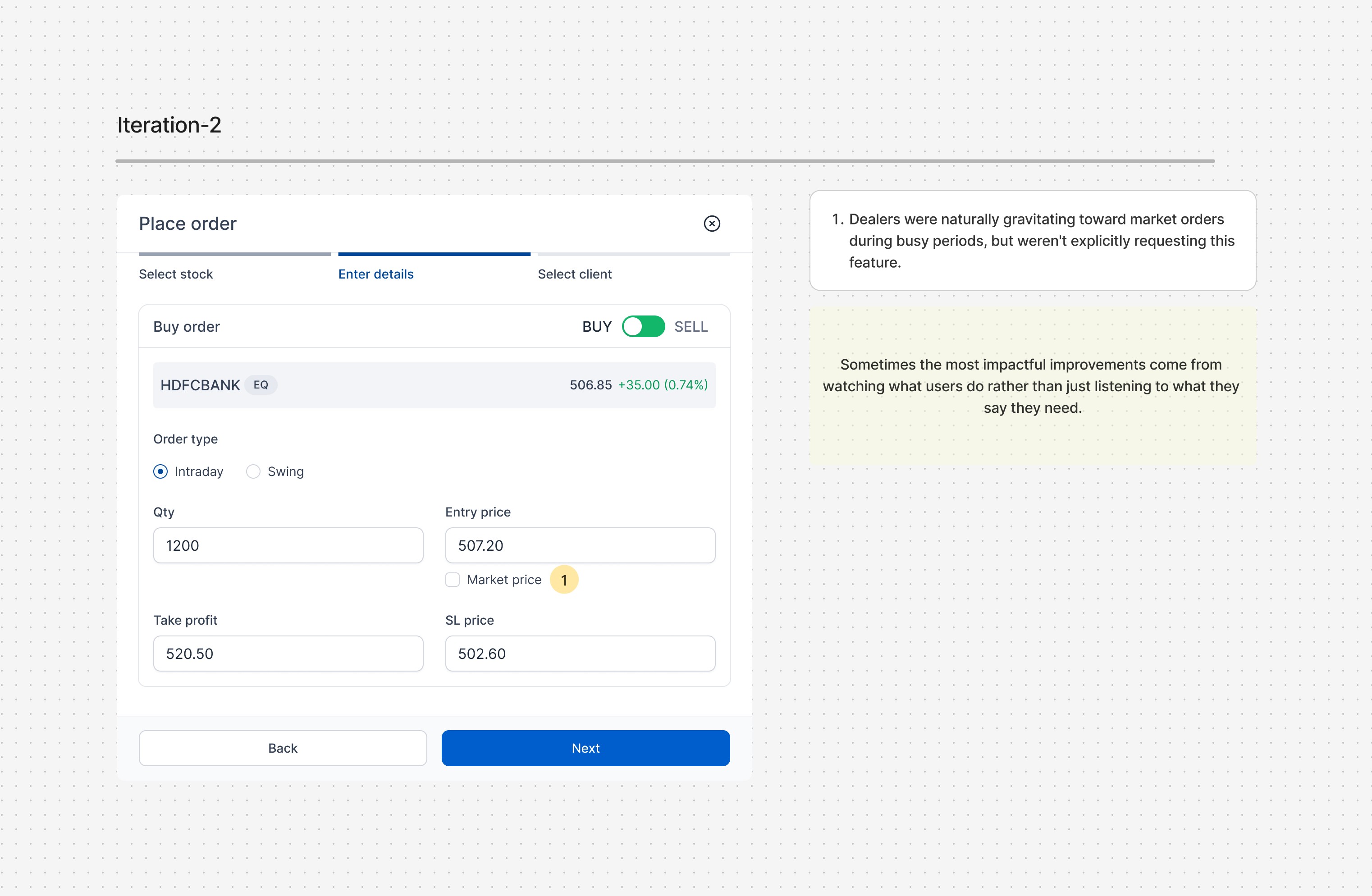 Solving one focused problem exceptionally well can have more impact than trying to fix everything at once - our multi-order system proved this by dramatically reducing trade execution time. Most importantly, we learned that great design often comes from watching what users do rather than just listening to what they say they need.