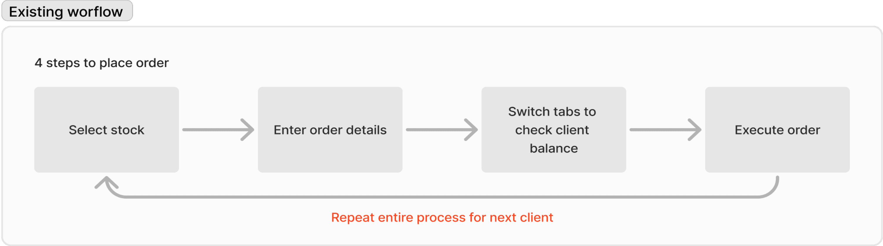 Analyzing the current workflow: Mapped the existing order placing flow form selecting stock to identify inefficiencies and bottlenecks.